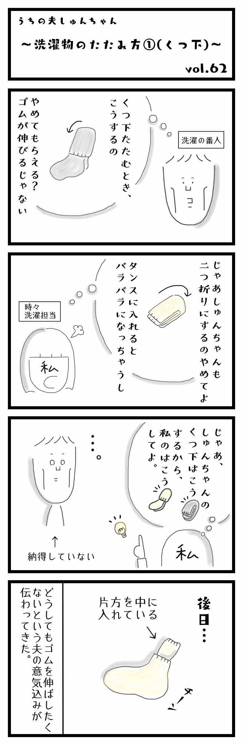 2020年02月09日 洗濯へのこだわり①(くつ下のたたみ方) 潔癖症で神経質な夫は、洗濯へのこだわりももちろん強く、洗えればなんでもいいという私には面倒くさいことこの上ないです。笑今では夫が洗濯担当で、夫が出張でいないときに時々私が洗濯する程度なので、ずいぶん楽になりました。( ̄∇ ̄)洗濯へのこだわりシリーズはこの後にも続きます。おわり。 < 前の記事次の記事 > コメント コメントフォーム 名前 コメント 評価する リセット リセット 顔 星 投稿する 情報を記憶